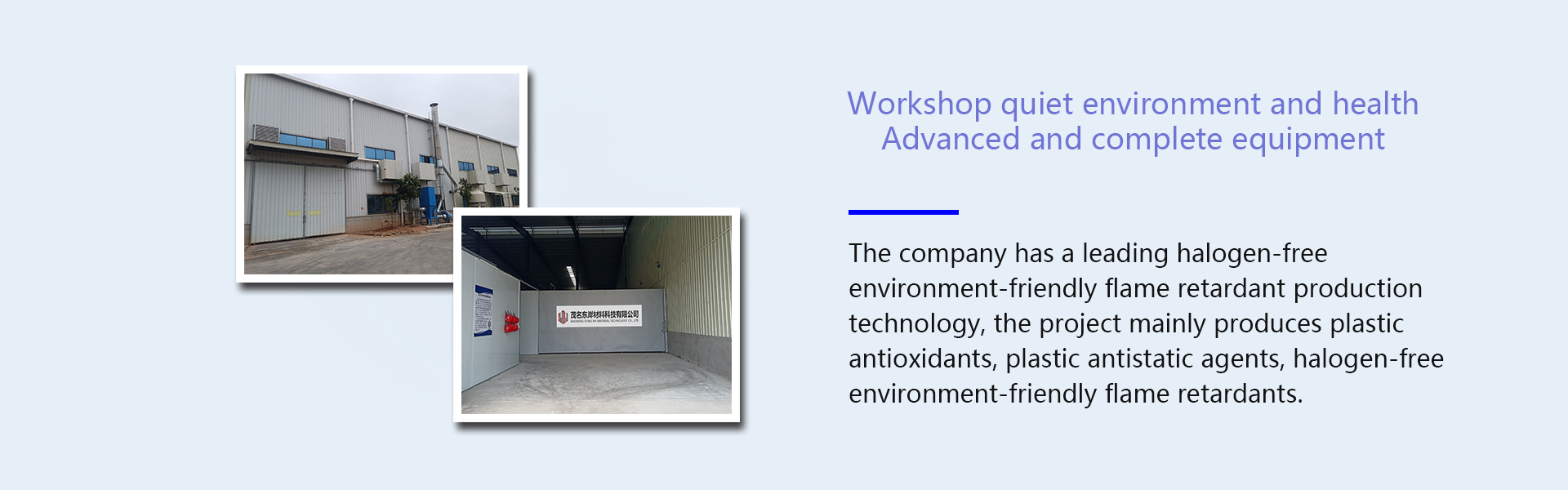 The company has advanced halogen-free environment-friendly flame retardant production technology, the project mainly produces plastic antioxidants, plastic antistatic agents, halogen-free environment-friendly flame retardants.